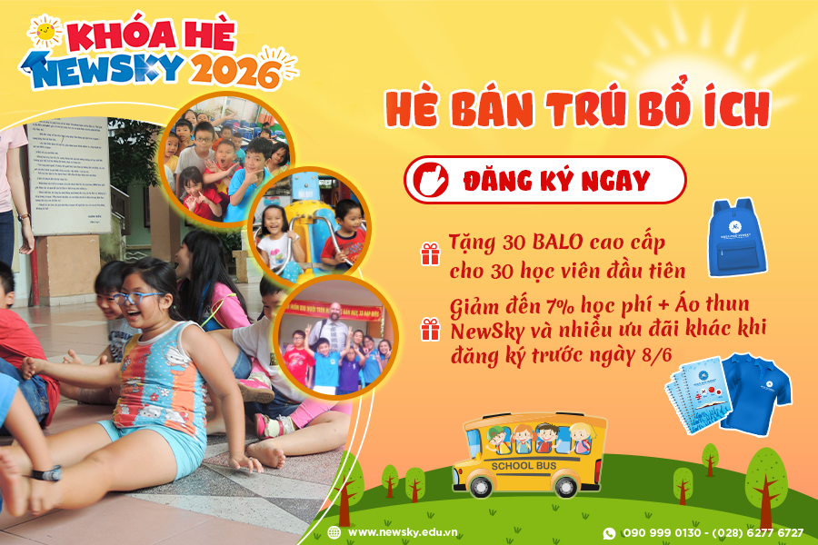 Một mùa hè nữa lại đến, các em học sinh chuẩn bị nghỉ hè và đến hẹn lại hội tụ tại Trung Tâm Ngoại Ngữ NewSky với các khóa học Anh văn hè bán trú. Một khóa học đáp ứng tốt nhất mong muốn tìm nơi gửi gắm con cho các phụ huynh trong dịp hè tại TP. Hồ Chí Minh.